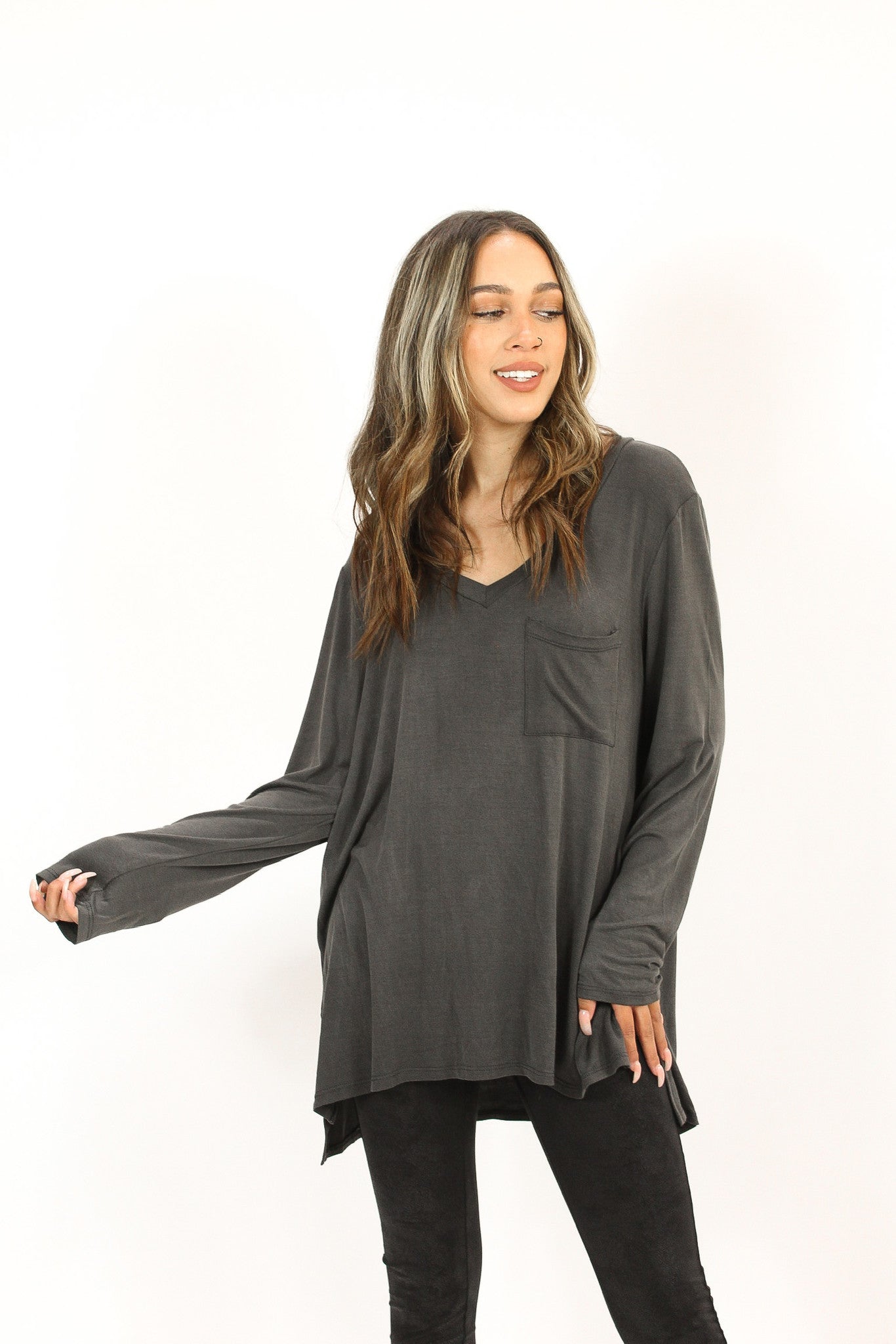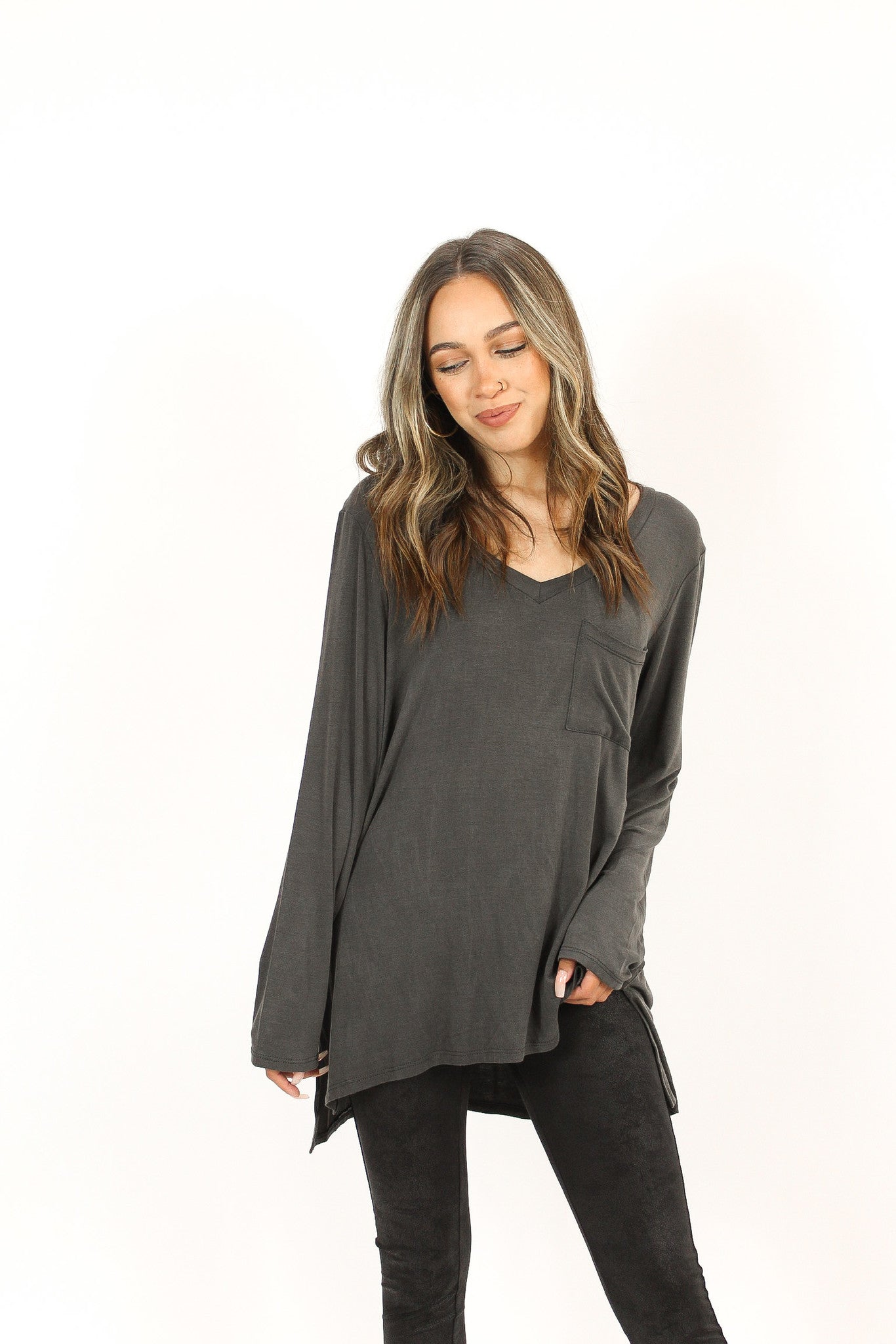 – Solid washed top with a V-neckline